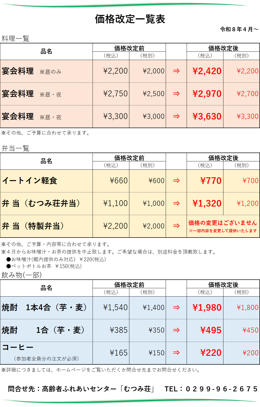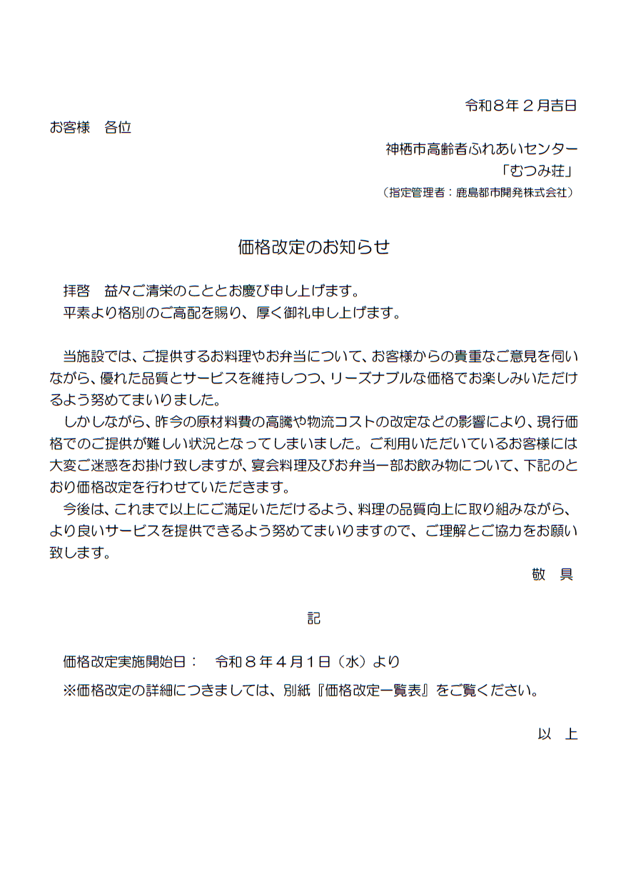 令和8年4月より ~価格改定のお知らせ~ 2026.02.24 Tweet Share Hatena Pocket RSS feedly Pin it Tweet Share Hatena Pocket RSS feedly Pin it 2026年 ~2月 献立のお知らせ🌸~前の記事
